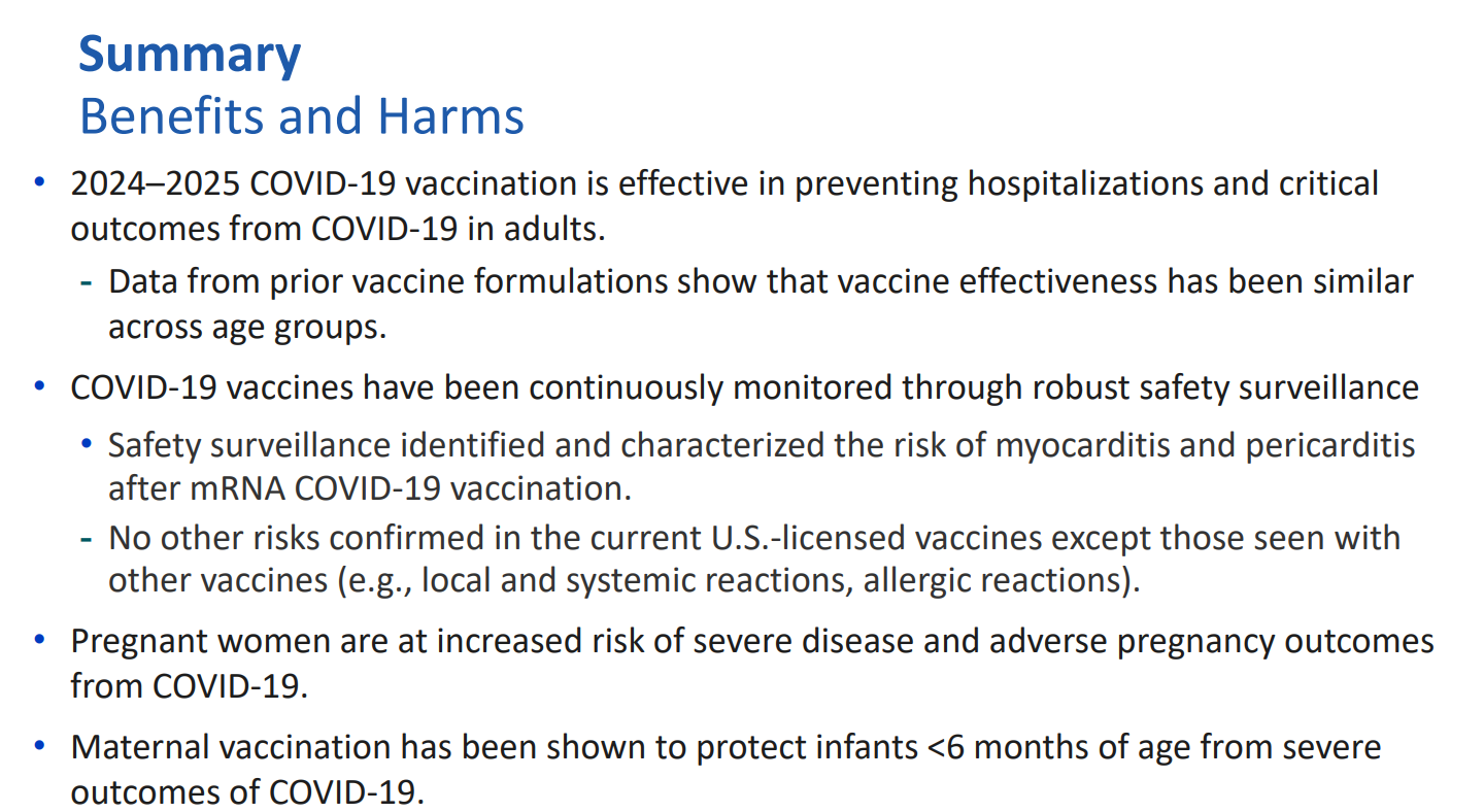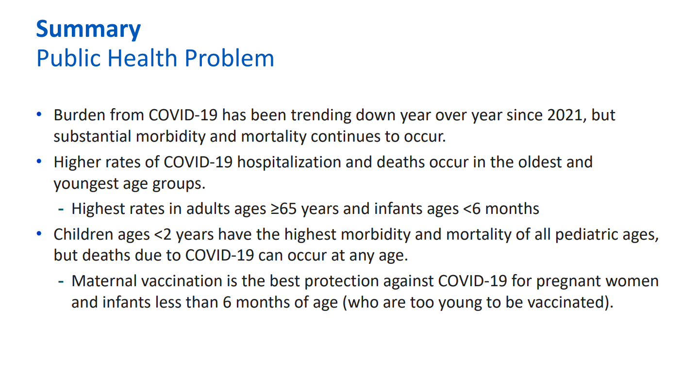 The meeting of CDC’s Advisory Committee on Immunization Practices (ACIP), deciders of our vaccine schedules, took place last week with RFK’s newly installed members. CDC experts provided evidence of COVID disease burden and benefits of COVID vaccines. You can access the presentation materials (slide presentations), the recorded meetings (COVID portion begins at minute 49.11), and the final votes on all vaccines.