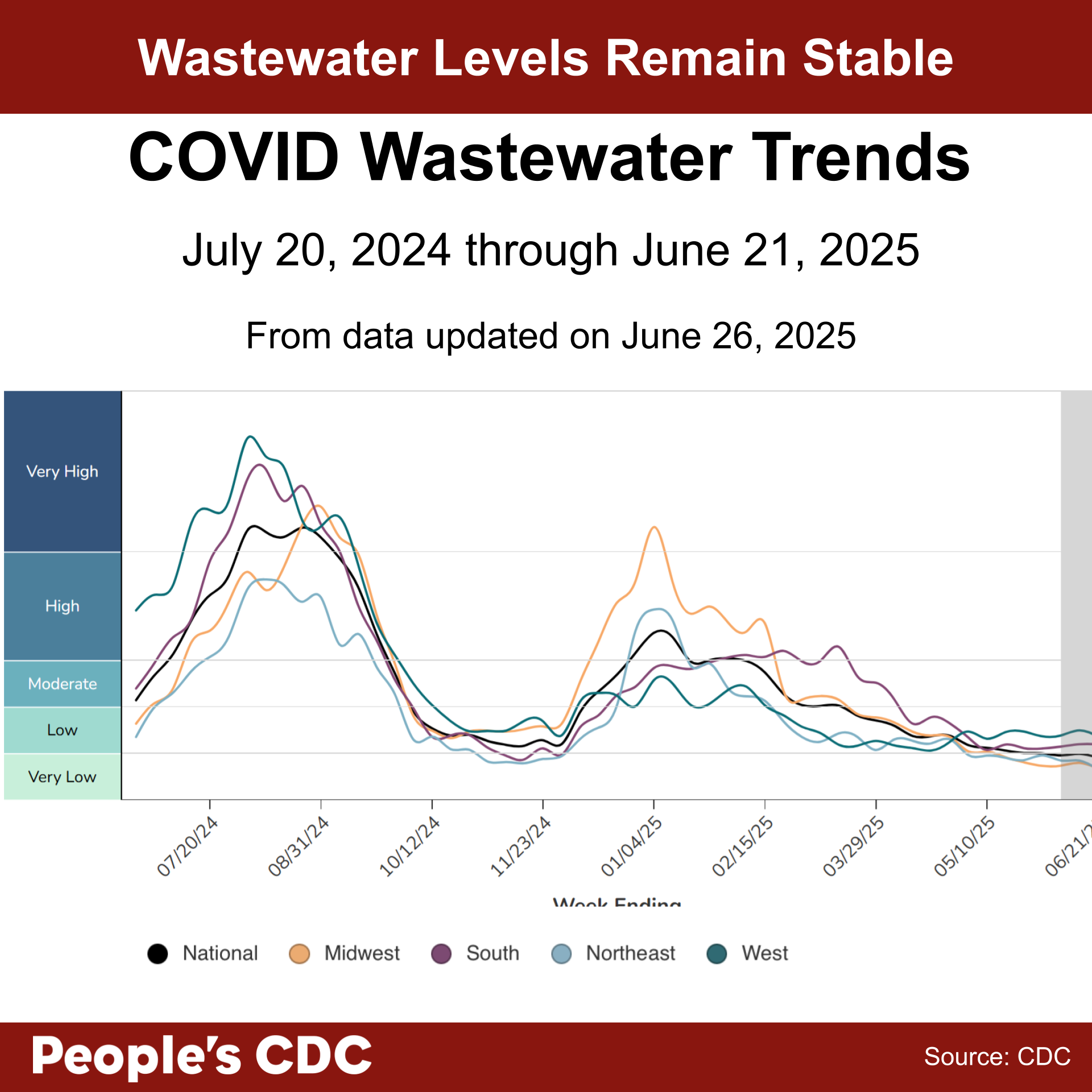 The most recent CDC national wastewater map, updated on June 26, 2025, shows data from June 15 to June 21 of this year. Light colors throughout the country show that low and very low levels of COVID were found in wastewater.